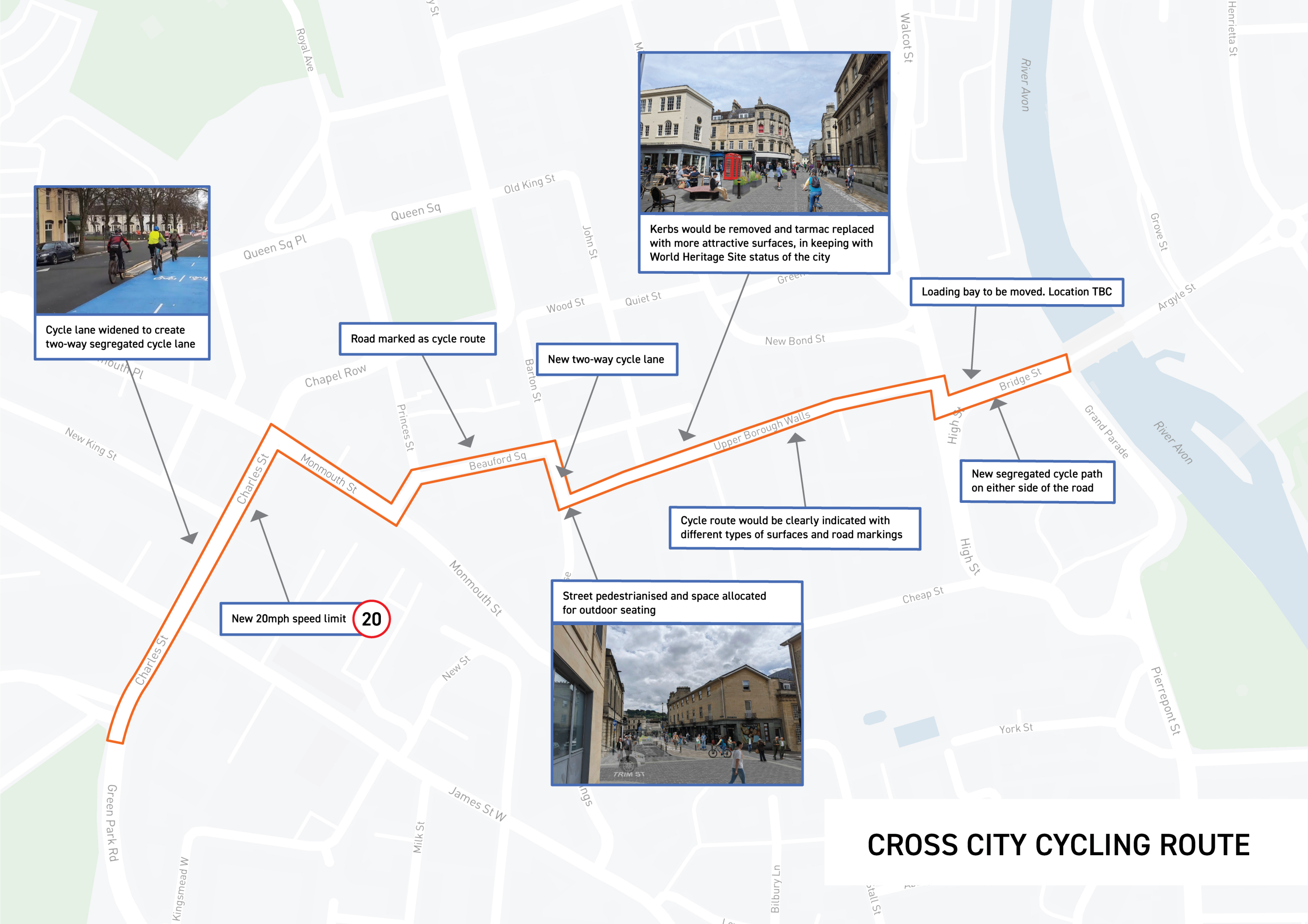 The proposals would change this route across the city centre, converting into a single two-way cycle route, running between Pulteney Bridge and New King Street.
