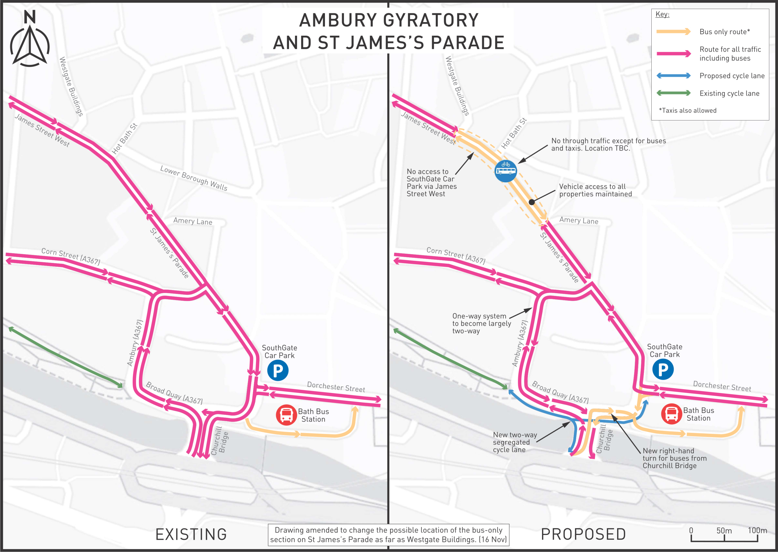 - Buses would be able to travel directly in both directions between Bath Bus Station and St James's Parade